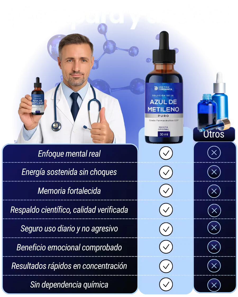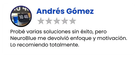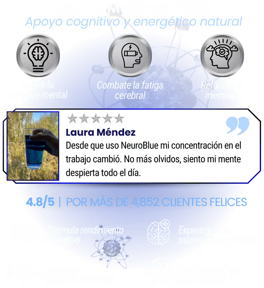 NeuroBlue no es un truco pasajero: su acción celular mejora la energía, la concentración y la memoria desde la base. A diferencia de estimulantes que solo enmascaran el cansancio, activa procesos que potencian tu mente de forma real, segura y comprobada, dándote la claridad, motivación y bienestar que necesitas cada día.
