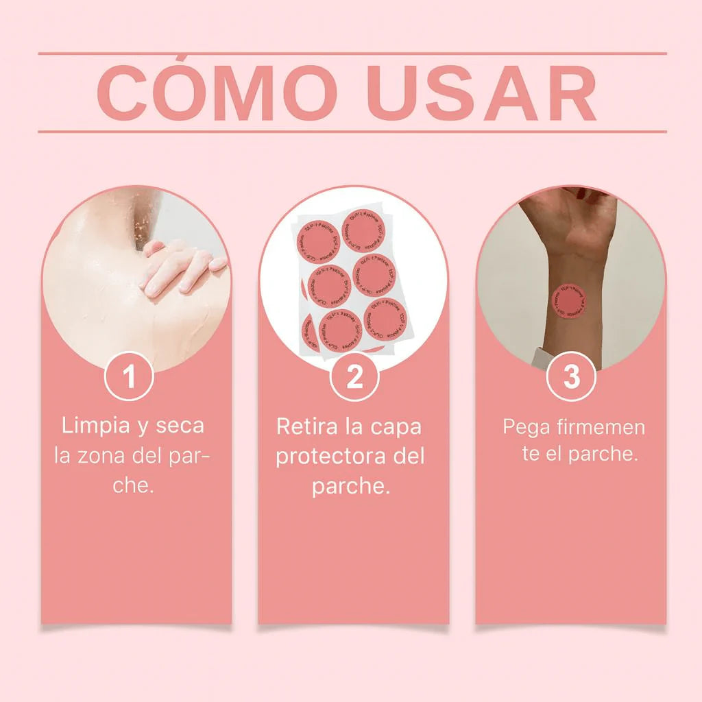 Aplica 1 parche al día sobre piel limpia y seca (brazos, abdomen o espalda). Cámbialo cada 24 h.